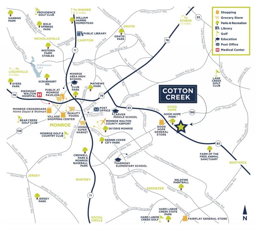 From Loganville/Between: Take 78 east, turn right onto GA-83 S, turn right onto Laboon Road, turn left onto Pleasant Valley Rd, turn right onto GA-83 S, Cotton Creek will be on the left.